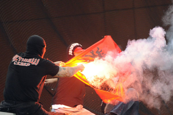 Henüz milli marşların okunması aşamasında olayın gidişatı az-çok belli olmuştu. Arnavutluk Milli Marşı’nın yuh sesleri nedeniyle neredeyse hiç duyulmadığını ancak Sırbistan Milli Marşı’nın coşkuyla okunduğunu söyleyebiliriz. Nitekim ilan edilen risk nedeniyle Arnavut taraftarlar maça alınmamıştı. Ancak yine de yüzlerce Kosova Kurtuluş Ordusu mensubunun maç için Belgrad’a ulaştığı ifade ediliyordu. Arnavutluk, Makedonya ve Kosova’dan taraftarlar Sırbistan’a geldi ancak bir kısmı da havaalanında durduruldu. Öte yandan Sırbistan İçişleri Bakanlığı ve Sırbistan Futbol Federasyonu’nun stada girecek Arnavutların hiçbir şekilde ulusal benlik ve karakteri simge eden veya edecek olan pankart, kaşkol ve benzeri eşya taşımaması yönünde karar aldığı duyuruldu. Kosova’da ya da Preşova’da yaşanan sorunların kökeninde zaten kimliğin bastırılmak istenmesi bulunuyor. Burada kuşkusuz ki olay çıkmasını engelleme niyeti var ancak güvenliğin sadece tek tarafın bastırılmasıyla sağlanmaya çalışılması da pek adaletli görünmüyor. Sabah saatlerinde ise son karar olarak Arnavutluk seyircisinin alınmayacağı açıklandı. Sonuçta tek taraflı önlem alınınca Arnavutluk bayrakları Sırbistan taraftarlarınca tribünlerde yakıldı ve Arnavut oyunculara sahada bulundukları sürece yabancı maddeler atıldı, sahaya meşaleler yağdı. Sadece Arnavutluk bayrakları değil, ABD, NATO ve Türkiye bayrakları da yakıldı. Ancak Arnavutlar da “inatçılıkları” ile bilinir. Bir anlamda, sahaya indirdikleri bayrakla son sözü yine Arnavutlar söylemiş oldu.