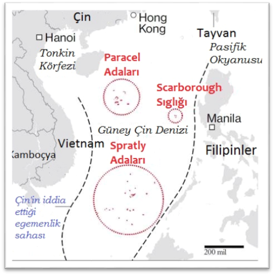 1978 yılından sonra hayata geçirilen ekonomik reformların ardından zenginleşen Pekin’in, son zamanlarda güçlenen deniz kuvveti ile birlikte yükselen bölgesel ihtirasları, sadece ihtilaflı Spratly Adaları ve Paracel Adalarıyla sınırlı kalmamış, ilgi ve etki alanını Güney Çin Denizi’nin tamamını kapsayacak şekilde genişletmeye başlamıştır. Bu nedenle Çin, 1948 yılına geri dönerek “Dokuz Çizgili Harita”yı canlandırmış ve deniz yetki alanları iddialarını bu haritaya dayandırmıştır.[23]
