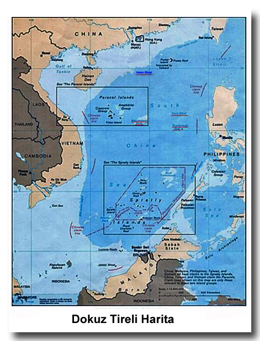 Çin 1948 tarihinde yayınlamış olduğu “Dokuz Çizgili Harita” haritaya dayanarak Paracel Adaları[19] ve Spratly Adaları’nı da içine alan, Güney Çin Denizi’nin neredeyse tamamının kendi egemenliği altında olduğunu iddia etmektedir. Bu merkezde, Spratly ve Paracel Adaları’nın tümü veya bir kısmının egemenliği konusunda Filipinler, Brunei Sultanlığı, Malezya, Tayvan ve Vietnam ile ihtilaflar yaşamaktadır.