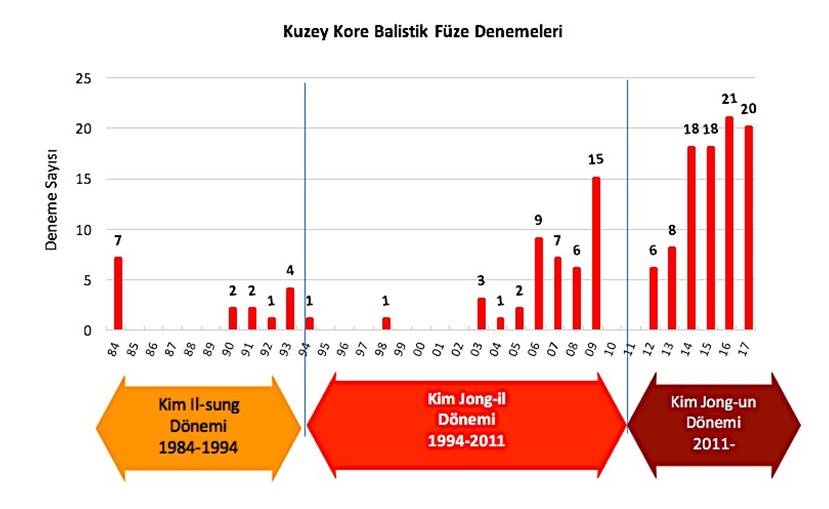 Balistik füze denemelerinin ABD ile 1994’te imzalanmış olan Çerçeve Antlaşması’ndan Kuzey Kore’nin 2002’de çekilmesiyle birlikte, Yongbyong’daki nükleer reaktörün tekrar faaliyete geçirmesinin ardından artmaya başladığı ve Kim Jung-un’un iktidara geldiği 2011’den buyana geçen altı senede denemelerin hız kazandığı görülüyor. Kim Jong il’in yönetimde olduğu 1994-2011 yılları arasında 44 balistik füze denemesi yapılmışken, son altı senede 101 füze atışı gerçekleştirildi.[5]
