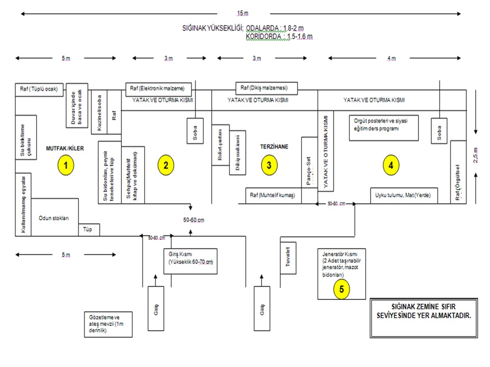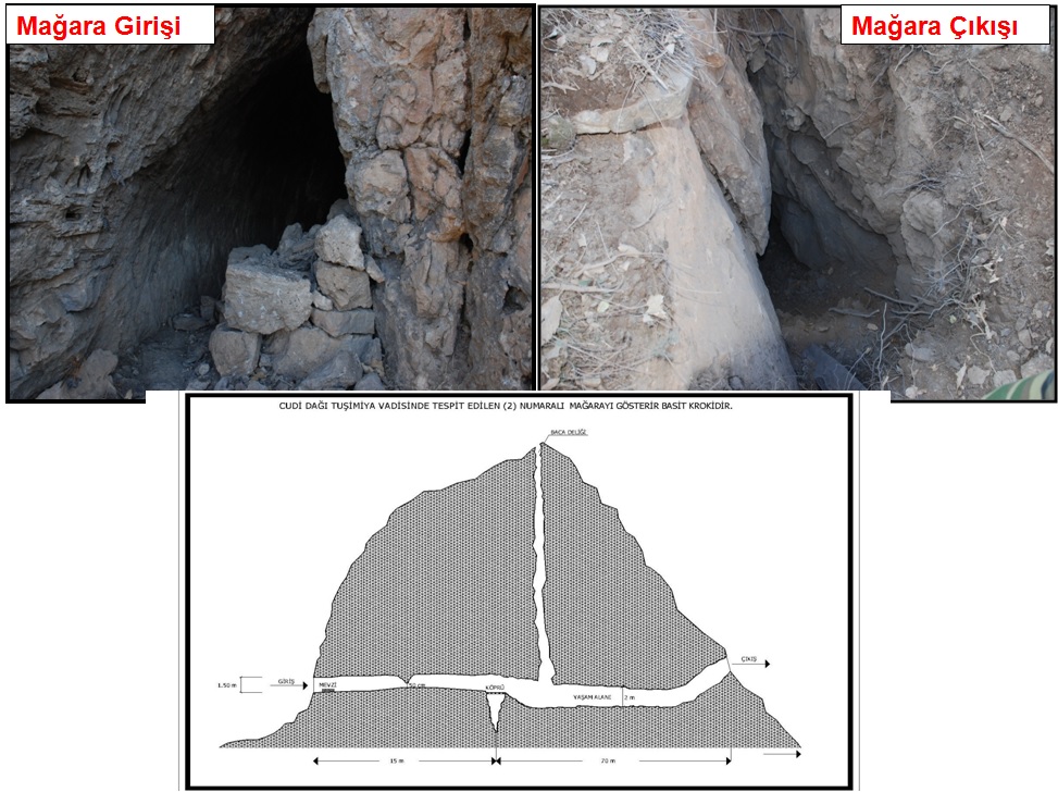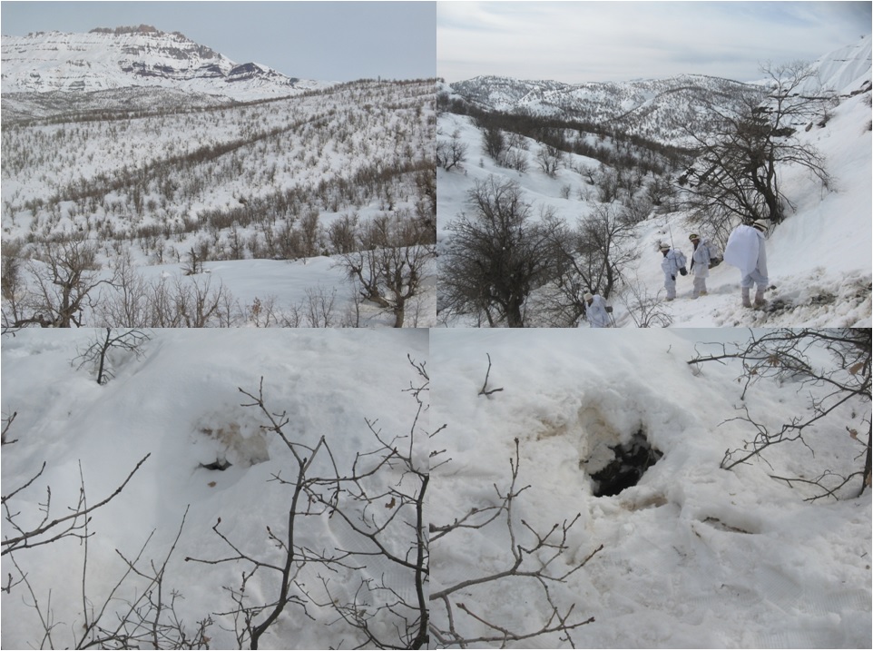 Burada doğal bir havalandırma bacası var. İşte Cudi sorumlusu dâhil çok önemli elemanlar burada ele geçirildi. Ve mağaranın krokisi. Bu başka bir mağara. Direk yerin altına doğru giriyor. İlk girdiniz noktadan sonra hep böyle merdivenlerle kat kat aşağı iniyorsunuz. Yedi katlı bir mağara. Üçüncü katı çok büyük. Bu mağara, yer altı suları vasıtasıyla oyulmuş doğal bir mağara. 3. katına çadırlar kurarak kış mevsimini geçirmek için hazırlık yapmışlar, bütün hazırlıklarıyla beraber ele geçirdiğimiz bir yer. Bu da Cudi’de başka bir bölge. Kayalıkların altında bir mağara var. 3 tane de girişi var ama bu 3 girişi de bir metre mesafeye gelseniz bile göremiyorsunuz. Biz inanın o deliği bulabilmek için yanımdaki timle 1 saat uğraştık.