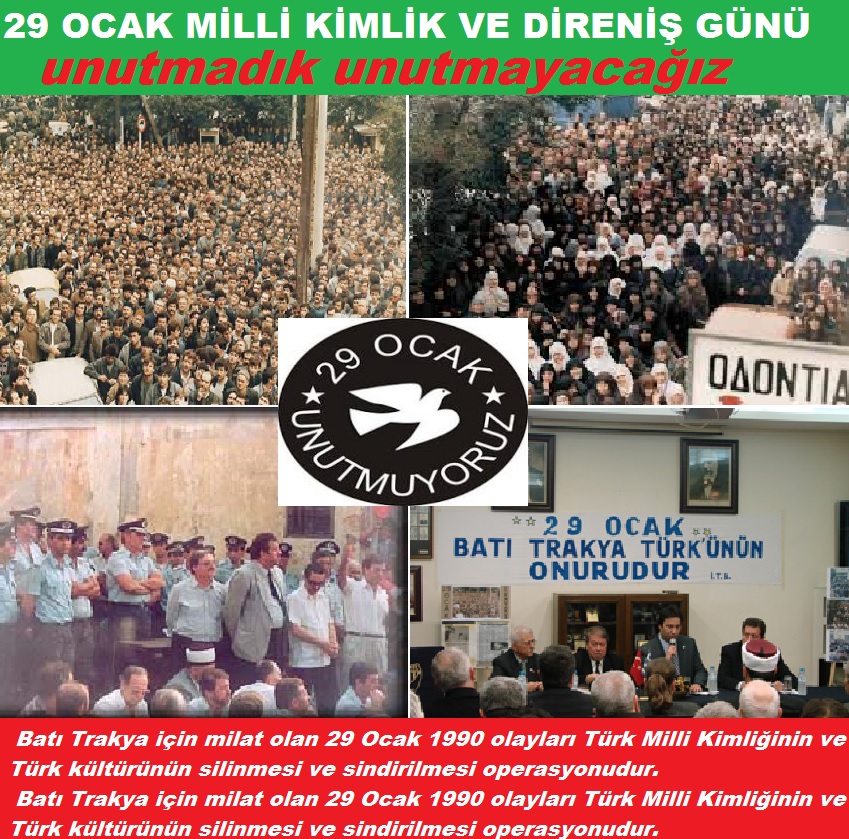 Batı Trakya Türkleri, her yıl Türk kimliğine dönük saldırılara karşı direnişe geçtikleri günü "29 Ocak Toplumsal Dayanışma ve Direniş Günü" ya da daha çok "29 Ocak Milli Direniş Günü" adlandırmasıyla Gümülcine, İskeçe, Türkiye ve yaşadıkları diğer ülkelerde düzenledikleri etkinliklerle anmaktadır. Anılan 29 Ocak 1988'de mahkemenin kapatma kararını protesto etmek ve Türklüğünü deklare etmek isteyen 20 bin Türkün tüm baskı ve engellemelere rağmen bir araya gelerek "Türküz" diye bağırmasıdır. Anılan aynı zamanda 29 Ocak 1990'da örgütlü Yunan fanatiklerinin saldırılarına rağmen yeniden bir araya gelebilmeleridir. 29 Ocak, Batı Trakya Türkleri için toprakları üzerinde yaşadıkları asimilasyona, vatandaşlık haklarının sınırlandırılmasına, azınlık haklarını alamamalarına, kimliksizleştirilmelerine karşı gösterdikleri iradenin yıldönümüdür. 29 Ocak 1988'de Batı Trakya Türklerini sokağa döken uygulamanın maalesef bugün de devam etmesi, her bir anma programına yeni bir protesto niteliği kazandırmaktadır; tam 24 yıldır protesto sürmektedir. Dolayısıyla Batı Trakya Türkü'nün "kimliksizleştirerek Yunanlaştırma" girişimlerine direnişi devam etmekte; 29 Ocak'lar birer bütünleşme gününe dönmektedir.
