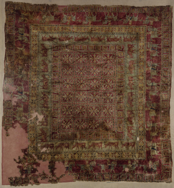 Dünyanın en eski halısı olarak bilinen, 200x190 cm ölçülerindeki ve santimetrekaresinde 36 düğüm bulunan halı, beş numaralı kurganda bulunmuştur.[94] Halının ortasındaki 24 adet çarpı işareti şekli verilmiş lotus motifini, etrafındaki kornişte bulunan 24 adet geyik figürü çevrelemekte, en dışta da 28 adet atlı savaşçı figürü bulunmaktadır. Halının desen ve motiflerinin özgünlüğünden hareketle aslında Altay bölgesine ait olmadığı, muhtemel bir ticaret ya da hediyeleşme sonucu bölgeye gelmiş bir İran (o dönemde Pers İmparatorluğu) halısı olduğu tartışılmaktadır.[95] Ancak Jean-Paul Roux halıdaki İran motiflerinden hareketle yapılan ‘İran’da dokunmuş olduğu’ şeklindeki değerlendirmelere şiddetle karşı çıkmaktadır, ona göre ren geyiği motifleri halının Sibiryalılığını kanıtlamaktadır ve zaten halı konar-göçer halklara özgü bir eşyadır.[96]